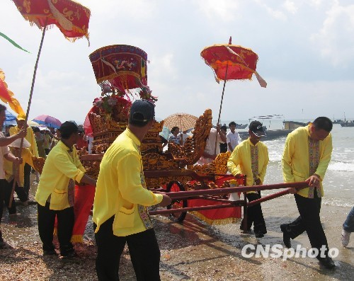 图为京族民众从海边迎神归返。中新社发 袁莺 摄