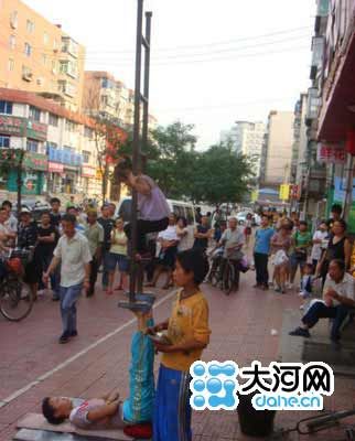 帖子以图文方式展示了几名年龄幼小、衣衫褴褛的孩子在沈阳街头卖艺的场景,特别是其中一名4岁的小女孩,脏脏的脸蛋、矮小的身子让网友们看了都心疼不已。通过图片我们可以看到,小女孩颤巍巍地上到一架铁梯子上,双脚勾住梯子杈,然后倒栽下去,梯子是另外一名年龄稍大的女孩用腿顶着,4岁女孩在那么高的梯子上倒悬着,看得人心惊肉跳。可能小女孩平时很少照相,当看到有围观者拍照,马上规规矩矩站好,然后咧嘴笑笑,脸上显出两个大大的酒窝,眼神纯净而又让人心疼。这样的年龄,正是在父母怀里撒娇,在幼儿园与小朋友们一起玩乐的时候,却不知为何流浪异乡,小小年纪就成了别人的赚钱工具!(薛素芬 时运斌)