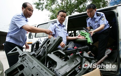 8月6日,北京警方对近期治爆缉枪专项行动中收缴的枪支和管制刀具进行集中收缴。据统计,共收缴气枪、自制枪、猎火枪等各类枪支176支,仿真枪367支,管制刀具1100余把。中新社发 李连杰 摄