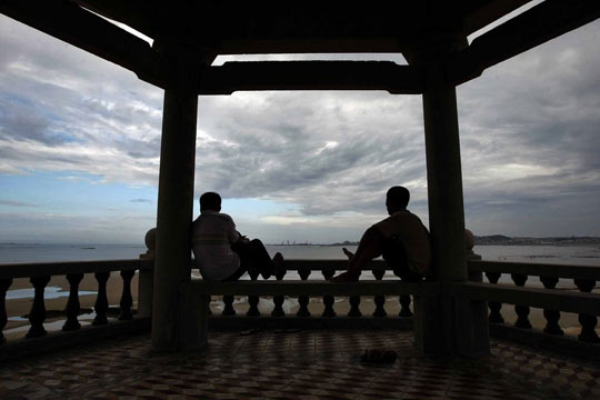 台风虽然要来,可是天气闷热。在福建晋江市深沪镇海边的深林宫两位市民正在望海亭中纳凉。欣赏天空出现的奇异景观。翱翔/CFP