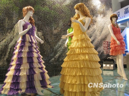 8月7日,在北京性用品展上的“避孕套婚服”。当日,第五届中国计划生育生殖健康新技术新产品博览会在北京开幕。中新社发 周群 摄