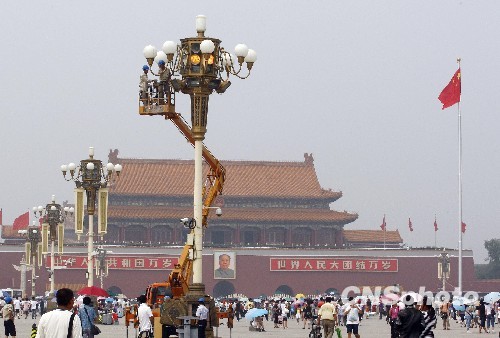 8月7日,一辆大型升降车在天安门广场正张开长臂,电力工人开始调修天安门广场华灯。中新社发 郑雄增 摄