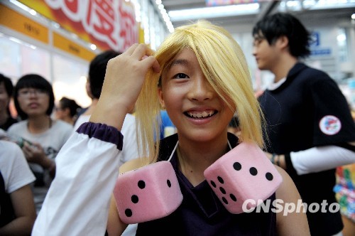 八月七日,首届深圳动漫节在会展中心开幕,动漫节上“cosplay”选手身着喜剧感的衣服,吸引摄影爱好者和参观者的眼球。中新社发 陈文 摄