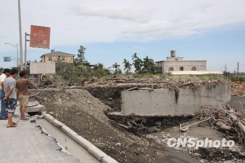 “莫拉克”台风重创台湾,重灾区之一的台东太麻里乡有数个住户被洪水冲走,平日的道路变成了河床。图为8月10日,几名当地居民来到现场,讲述一夕间的巨变。中新社发 董会峰 摄