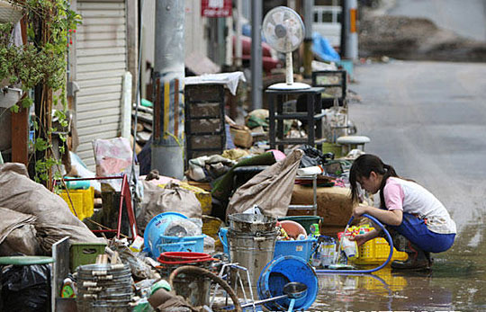 在日本本州岛兵库县,一名女孩在路边清洗自家物品。