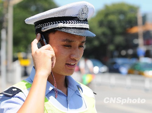 8月11日中午,并不当班的北京交警孟昆玉在接听电话了解交通信息。中新社发 侯宇 摄