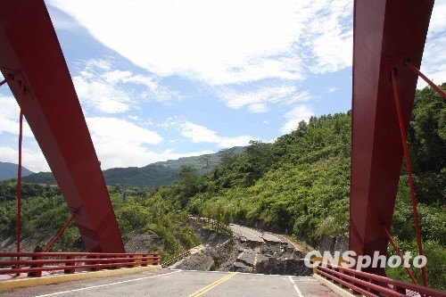 图为延平乡松枫大桥与公路联结处,被洪水冲垮、坠落数米深的溪谷。中新社发 董会峰 摄