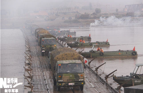 8月11日,“跨越-2009”系列实兵演习正式拉开序幕,兰州军区某师摩托化部队机动从浮桥上通过。