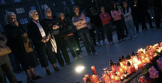 8月11日,在斯洛伐克首都布拉迪斯拉发东北的汉德洛娃,人们点燃蜡烛,悼念遇难的矿工。10日上午,汉德洛娃煤矿发生瓦斯爆炸事故,造成20名矿工死亡。
