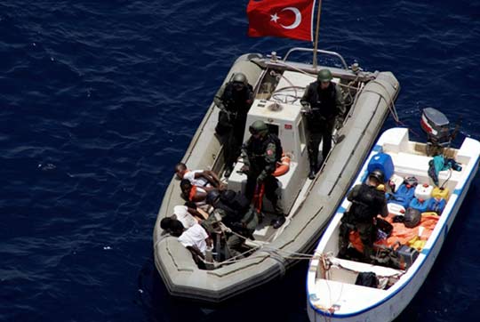 8月11日,土耳其军方称土海军在亚丁湾抓获准备实施抢劫的5名海盗。图为一艘土耳其护卫舰拦截了一艘小艇并抓获了5名海盗。