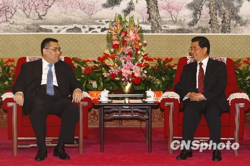 8月12日,国家主席胡锦涛在北京中南海会见澳门特别行政区第三任行政长官崔世安。中新社发 盛佳鹏 摄