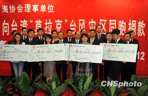 8月12日,海协会理事单位向台湾台风“莫拉克”受灾地区捐款仪式在北京举行,18家海协会理事单位一共捐款1亿600万人民币、500万港币。