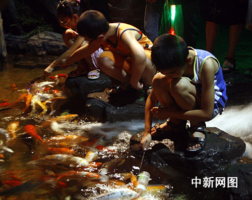 图为小学生拿奶瓶喂鱼。张畅 摄