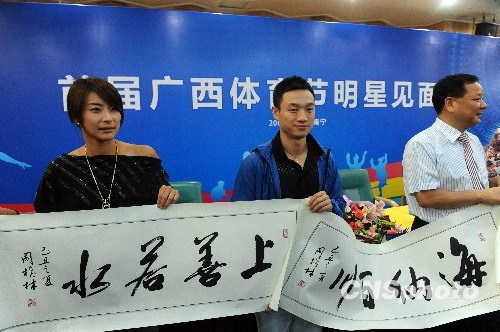 八月十二日,跳水世界冠军郭晶晶和体操冠军杨威出席广西体育节媒体见面会。