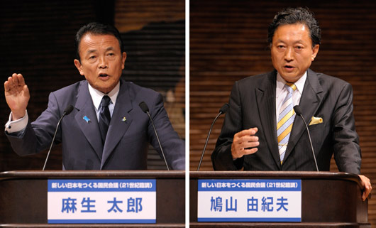 日本首相、执政党自民党总裁麻生太郎与日本最大在野党民主党代表鸠山由纪夫的党首讨论于12日下午在东京都内的饭店举行。