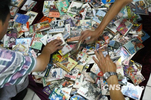 8月13日,第七届全国连环画交易会在北京潘家园旧货市场开幕,来自全国各地的连友们齐聚一堂,共同参与这场连环画收藏界的盛会。包括《九华山的传说》、《武则天的故事》等珍贵的原始插图底稿将现身此次交易会。此外,经典系列套书《宋史》、《西游记》、《兴唐传》,钱笑呆的《荆钗记》、赵宏本的《桃花扇》等老版连环画都将在此次连环画拍卖会上亮相。中新社发 富田 摄