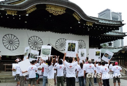 高金素梅8月11日率领“还我祖灵队”约50人首度成功“突袭”进入日本靖国神社正殿前的大广场,要求靖国还我祖灵及日本谢罪赔偿。中新社发 918网老吴 摄