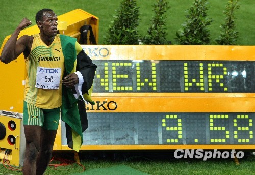 当地时间8月16日晚(北京时间8月17日凌晨3点45分),柏林世界田径锦标赛男子100米决赛鸣枪,世界纪录保持者、北京奥运会冠军、牙买加选手博尔特轻松地以9秒58的惊人成绩获得冠军,并打破他自己创造的9秒69的世界纪录。
