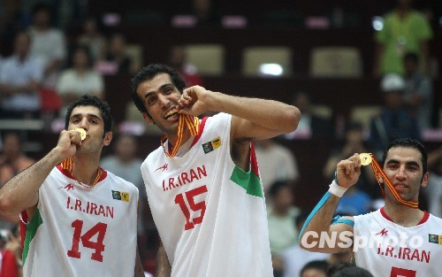 图为伊朗队哈达迪(中)与队友庆祝。中新社发 张宇 摄