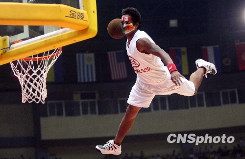 图为赛前精彩的“扣篮表演”活跃场上气氛。中新社发 张宇 摄