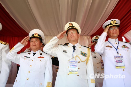 八月十七日是印度尼西亚独立六十四周年纪念日。上午十时整,在印尼国歌声中,来自十五个国家的代表团以及各国使节肃然起立,向印尼国旗敬礼。广州军区副司令员兼南海舰队司令员苏支前少将代表海军司令员吴胜利参加了庆典活动。 中新社发 仲继军 摄