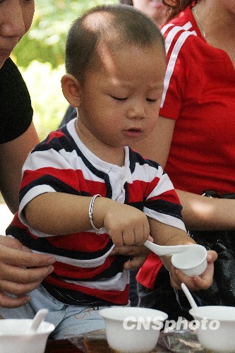 8月18日,中国茶乡福建武夷山一位孩童在当地一场乡村民间斗茶赛上学习品茶。 中新社发 周文杰 摄