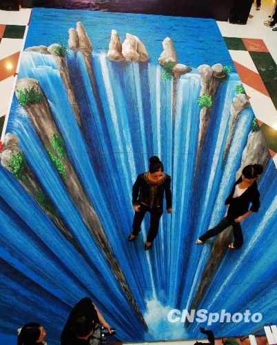 8月18日,由德国街头3D立体画创作大师Edgar Muller制作的世界自然遗产重庆武隆喀斯特地貌中的瀑布3D画亮相山城,吸引大批市民前往参观。图为没有通过特殊镜面拍摄的3D立体画十分逼真,模特站在其上如临深渊。中新社发 郭晋嘉 摄