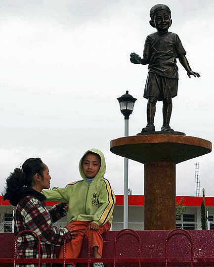 在墨西哥拉格洛里亚为世界首名确认为甲型H1N1流感患者埃德加·埃尔南德斯设立的雕像于8月16日揭幕。今年5岁的埃德加是墨西哥首名被确诊感染甲型H1N1流感病毒的患者,经过一周多的普通治疗后奇迹般康复。