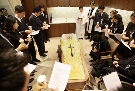 韩国前总统金大中的入殓仪式20日中午在首尔塞弗伦斯医院临时灵堂举行,灵柩随后被运往设立在国会正门前的正式灵堂。