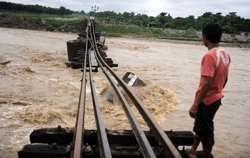 8月20日,印度村民站在路边望着被洪水冲走的铁路桥,过去24小时内连续降雨形成的洪水冲毁了部分道路,造成孟加拉北部地区的一些山丘山体滑坡。截至目前,塌方已造成2人死亡。