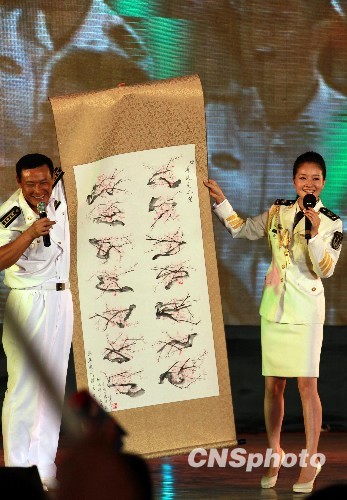 8月21日晚上,海军慰问第二批护航编队文艺演出在广东湛江某军港露天举行,海政文工团众多演员“你方唱罢我登场”,用嘹亮的歌场和优美的舞蹈等慰问远航归来的官兵们。图为海政文工团年轻歌手孙佳演唱间隙,编队“深圳”号导弹驱逐舰通过她向海政文工团赠送一梅花篆体字对联竖轴。中新社发 孙自法 摄
