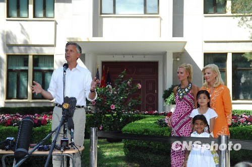 8月22日下午,美国新任驻华大使Jon Huntsman(中文名:洪博培,左一)在北京美国驻中国大使馆新闻处举行媒体见面会。洪博培发表了履新感言并介绍了他的家人。中新社发 侯宇 摄