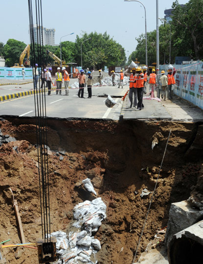印度新德里遭遇暴雨 路面塌陷成坑(2)