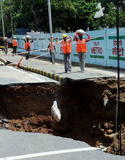 印度新德里遭遇暴雨 路面塌陷成坑(3)