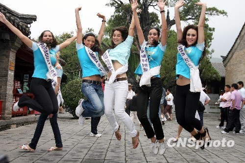 8月23日,来自120个国家和地区的2009国际旅游小姐冠军总决赛的选手们,在河南登封嵩阳书院的汉封将军柏前欢呼雀跃拍照留念,并参观嵩阳书院感受中国传统文化。嵩阳书院在历史上曾是佛教、道教场所。中新社发 王中举 摄