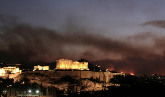 23日,希腊雅典卫城后面的森林大火冒起滚滚浓烟。