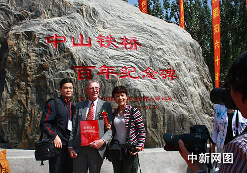 铁桥修建时,由比利时人阿德、美国人满宝本、德国人德罗作为技术指导,今天,兰州市邀请他们的后裔参加此间庆典,市民热情邀请他们合影留恋。 殷春永 摄