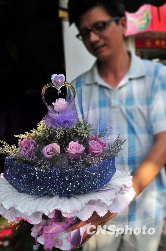 8月26日是农历七月初七,中国传统的七夕情人节。此间市场玫瑰价涨,新品种“台湾紫皇后”身价不菲,一小束近二百元人民币,但在福州仍大受欢迎。中新社发 张丽君 摄