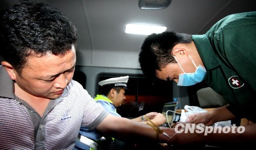 医务人员对涉嫌醉酒驾驶人员进行血液检测。中新社发 陈仕川 摄