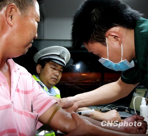 医务人员对涉嫌醉酒驾驶人员进行血液检测。中新社发 陈仕川 摄