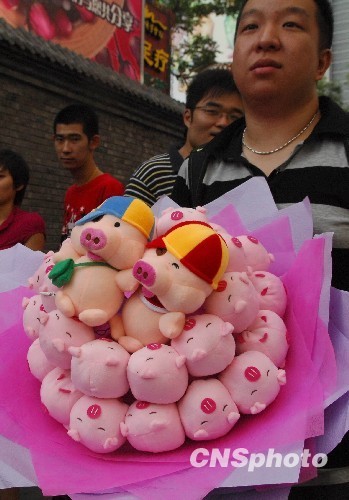 8月26日是中国传统的“七夕”情人节,北京一名男子手持新潮的“麦兜猪”形象的花束准备送给女友。中新社发 侯宇 摄