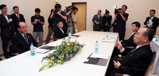 韩国代表团26日下午3时30分抵达金刚山,在金刚山酒店与朝方联络官接触后,重点讨论了会谈日程。当天下午5时举行首次全体会议,交换主旨发言。