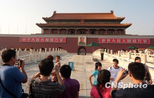8月26日,游客在修缮一新的天安门城楼前拍照留念。截至8月25日,天安门城楼、观礼台等粉刷修缮工程已完成施工面积3﹒08万平方米80%以上的工作量,全部工程将于9月10日前全部结束。据介绍,天安门城楼在每年国庆前都会维修一次,今年天安门城楼等粉刷修缮等工程于5月份提前启动,以迎接国庆60周年的到来。 中新社发 吴芒子 摄
