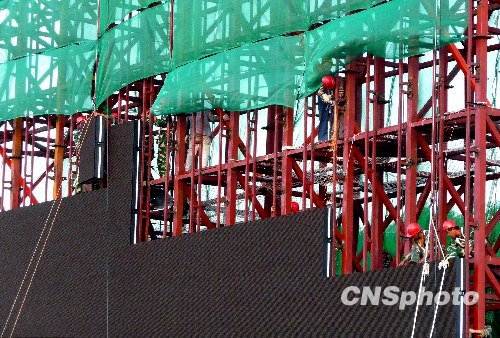 2009年8月27日下午,北京天安门广场东侧,工人们已搭建起了一座近20米高的钢架,并开始在上面安装超大液晶屏幕。据施工人员介绍,为迎接建国60周年庆典的到来,天安门广场东、西两侧将分别安装两块300多平米的超大液晶屏幕。 中新社发 玉龙 摄
