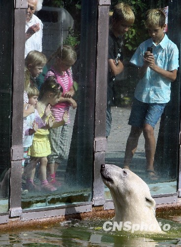 秋季的柏林艳阳高照气温一路走高,在世界最大的动物园--柏林动物园内的北极熊明星一边在水中戏耍一边与参观的小朋友“交谈”。中新社发 任晨鸣 摄