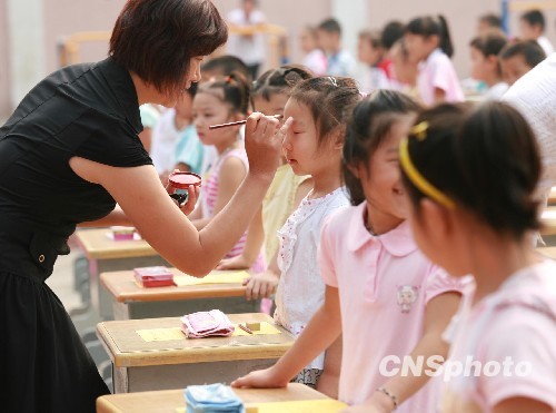 河南郑州老师们正在对刚入学的小学生进行“朱砂启智”。中新社发 王中举 摄
