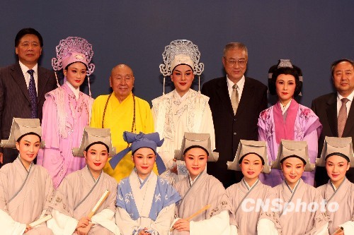 图为中台禅寺开山方丈惟觉长老(后排左三)、中国国民党副主席吴敦义(后排左五)、中华文化联谊会顾问周和平(后排右一)、中华宗教文化交流协会会长叶小文(后排左一)等人,与成功演出新版越剧《梁祝》的众演员合影留念。中新社发 董会峰 摄