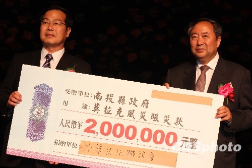 图为中华文化联谊会负责人、文化部副部长周和平,向南投县县长李朝卿转交200万元人民币善款。中新社发 董会峰 摄