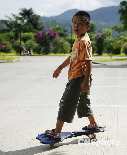 8月29日中午,一名小男孩在南伞街头玩滑板。中新社发 刘冉阳 摄