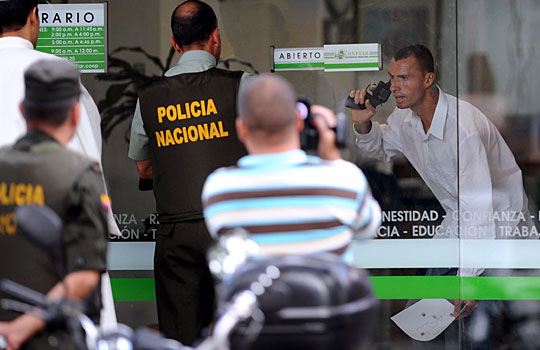9月2日,在哥伦比亚安蒂奥基亚省,一名男子抢劫了一家银行。在与闻讯而来的警方对峙时,该名男子先释放了所有人质,然后举枪企图用自杀来威胁警方。经过警方谈判专家几个小时劝解,该名男子最后向警方投降。